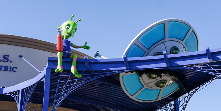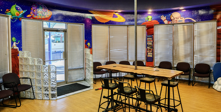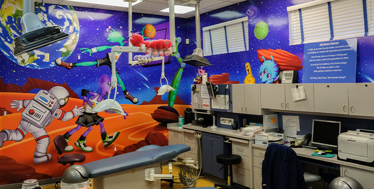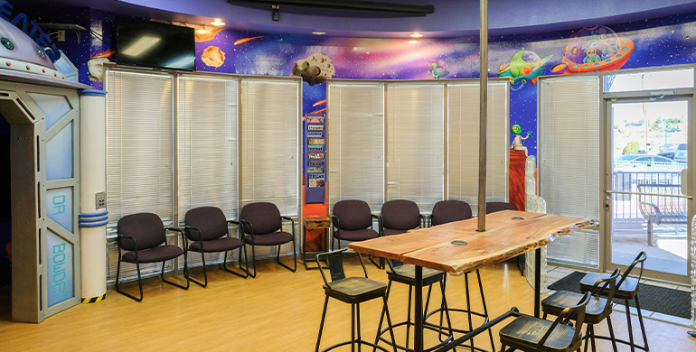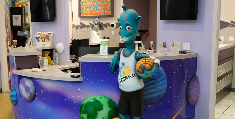 Our practice is truly one-of-a-kind. Really, you won’t see anything like it anywhere else in the world! You’ll get a taste of our alien/outer space theme as soon as you pull up when you see a mysterious but friendly alien who accidentally crashed his UFO on our roof! When your child walks in, they’ll be able to enjoy our Galaxy Theater and fun, immersive Rocket Ship play area. As a parent, you’ll wish that you got to go to a dental office this cool when you were younger!